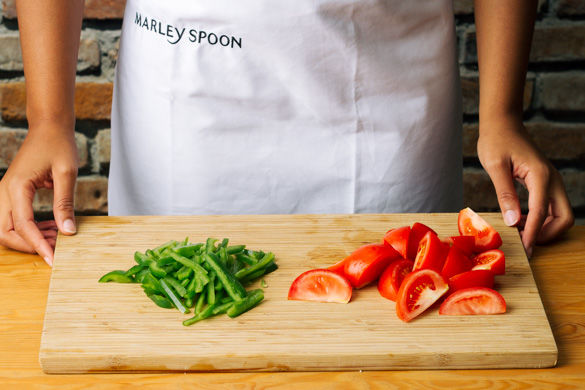 In einen mittleren Topf ausreichend gesalzenes Wasser für die Nudeln zum Kochen bringen. Die Paprika vierteln, vom Kerngehäuse befreien und in feine Streifen schneiden. Die Tomaten achteln.
