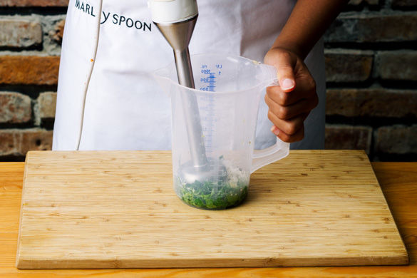 In einem höheren Gefäß die Petersilie mit ca. 1/3 geriebenen Käse und 2-3EL Olivenöl sowie Salz und Pfeffer mithilfe eines Stabmixers zu einem cremigen Pesto pürieren, ggfs. etwas Wasser hinzufügen.