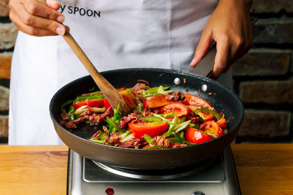 Inzwischen in einer großen Pfanne 1EL Olivenöl erhitzen und die Paprikastreifen für ca. 2-3Min. scharf anbraten, dann die Schinkenstreifen, Tomaten und Lauchzwiebeln hinzufügen und für weitere ca. 1-2Min. mitbraten.