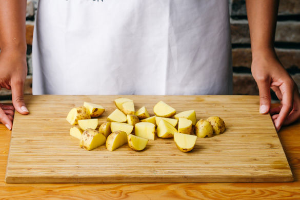 Den Ofen auf 220°C Umluft oder 230°C Ober-/Unterhitze vorheizen. Die Kartoffeln nach Wunsch schälen und in ca. 1cm große Würfel schneiden.