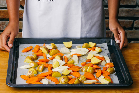 Das Gemüse samt Kartoffeln auf ein mit Backpapier ausgelegtes Backblech verteilen, gut mit 1EL Olivenöl und 1 Prise Salz mischen und für ca. 15-20Min. im Ofen rösten.
