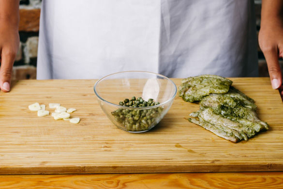 Für die Marinade die Schale der Zitrone abreiben, eine Hälfte entsaften, die zweite in Spalten schneiden. Die Petersilie mit den Stängeln fein hacken. Petersilie und Zitronenabrieb mit 2-3EL Olivenöl und 1EL Zitronensaft vermengen, den Knoblauch und die Kapern dazu geben und mit Salz, Pfeffer und 1Prise Zucker abschmecken.
