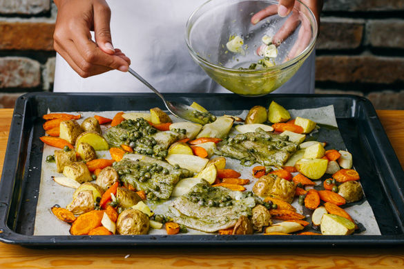 Heute in deiner Box: frischer Seelachs, der im Ofen in einer Marinade aus gehackten Karpern, Zitronensaft und gehackter Petersilie saftig gart. Dazu gibt es geröstete Petersilienwurzel, Karotten und Kartoffeln. Guten Appetit!