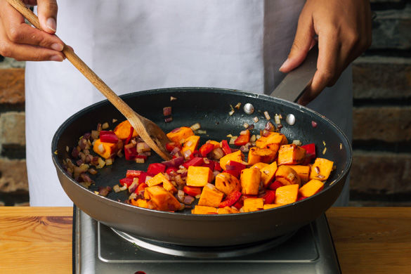 In einer großen Pfanne ca. 1-2EL Pflanzenöl erwärmen und Zwiebeln, Süßkartoffeln und Paprika darin für ca. 4-5Min. scharf anbraten.