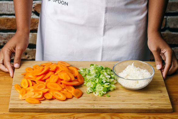 Die Karotten schälen, die Enden abschneiden und die Karotten schräg in dünne Scheiben schneiden. Die Lauchzwiebeln putzen und in feine Ringe schneiden. Den Käse reiben.