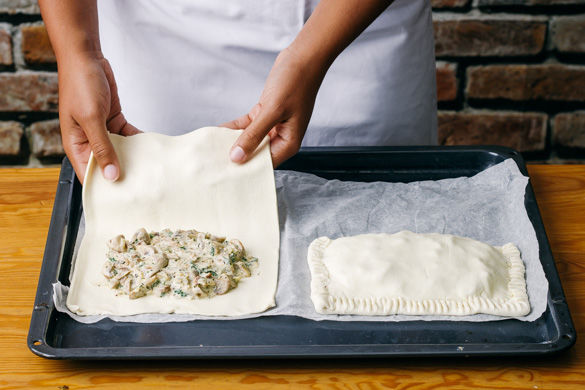 Diese strudelartigen Blätterteigtaschen waren in unserer Testküche ein richtiger Hit. Kein Wunder, denn unter dem knusprigen Blätterteig versteckt sich eine cremige Füllung aus Pilzen und Käse. Dazu gibt es einen frischen Salat mit Petersilie und feine, in Butter gegarte Karotten. Wer könnte da schon widerstehen?