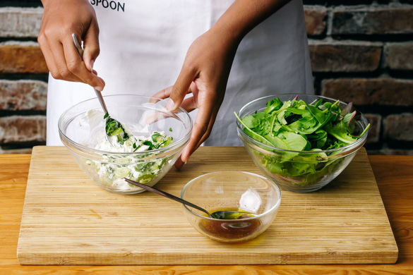 Die restliche Petersilie mit den Lauchzwiebeln und der restlichen sauren Sahne vermischen und mit Salz und Pfeffer abschmecken. 1–2EL Öl, 1–2EL Essig, 1EL Wasser sowie Salz und Pfeffer zu einem Dressing verrühren und den Salat kurz vor dem Servieren damit vermengen. Die Pilztaschen mit dem Salat, den Karotten und dem Petersiliendip servieren.