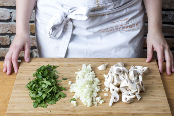 Den Backofen auf 200°C Umluft (220°C Ober-/Unterhitze aufheizen). Die Pilze mit etwas Küchenkrepp oder einer Bürste putzen und sechsteln. Die Zwiebeln schälen und in feine Würfel schneiden. Die Petersilienblätter von den Stängeln zupfen und grob hacken.