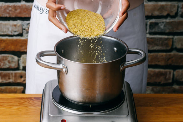 400ml gesalzenes Wasser in einem mittleren Topf zum Kochen bringen. 1EL Öl hinzufügen und Bulgur rein rieseln lassen, die Hitze abdrehen und mit Deckel für ca. 10-12Min. dünsten. Im Anschluss mit einer Gabel auflockern.