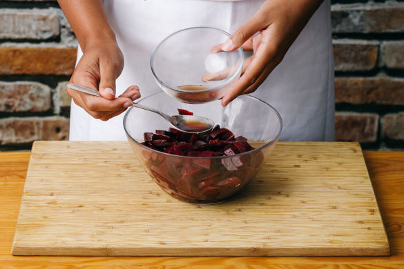 Inzwischen die Rote Beete längs vierteln und in dünne, schräge Scheiben schneiden. Mit Himbeeressig und einer großen Prise Salz marinieren und gelegentlich umrühren. Tipp: Da Rote Beete stark färbt, am besten Handschuhe und Schürze tragen.