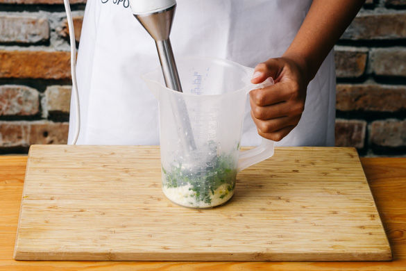 Die Hälfte des Käses mit 1Prise schwarzem Pfeffer, 1EL Olivenöl, 2-3EL Wasser und der Hälfte der der Kräuter mithilfe eines Stabmixers cremig pürieren.