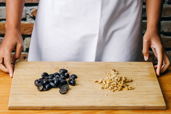 Die Walnüsse grob hacken. Die Trauben halbieren.