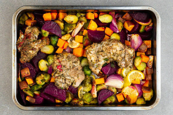 Es soll ja Leute geben, die keinen Rosenkohl mögen. Unvorstellbar, sagen wir. Wie könnte man den kleinen Sprossachsen, die heute zitronig angemacht und in Begleitung von Süßkartoffeln und Rote Bete daherkommen, widerstehen? Dazu gibt’s Hähnchenschenkel, deren Knochen wir schon für dich entfernt haben, damit heute nur der Ofen ackern muss. Du musst Gemüse und Fleisch nur noch entspannt in den cremigen Knoblauchdip tunken. Mmmh!