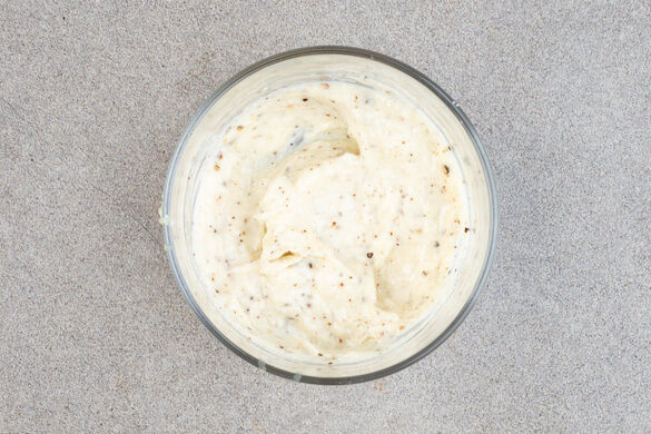 Den Knoblauch schälen, fein würfeln und mit 4EL Mayonnaise und 1 Prise Pfeffer verrühren. Das Gemüse und das Fleisch auf Teller verteilen und mit dem Dip servieren.