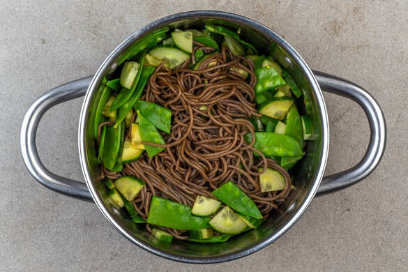 Sobald das Wasser kocht, ⅔ der Nudeln in das kochende Wasser geben und ca. 2Min. kochen. Dann die Kaiserschoten dazugeben und weitere ca. 2Min. mitkochen, bis die Nudeln bissfest sind. Alles in ein Sieb abgießen und gut mit kaltem Wasser abspülen.