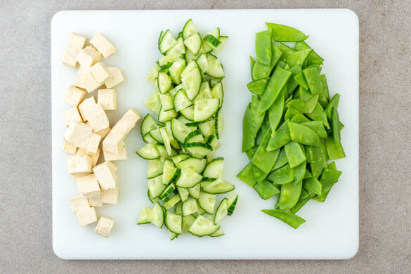 Die Kaiserschoten in der Mitte einmal durchschneiden. Die Gurke längs vierteln und in kleine Stücke schneiden. Den Tofu trocken tupfen und in ca. 2cm große Würfel schneiden.