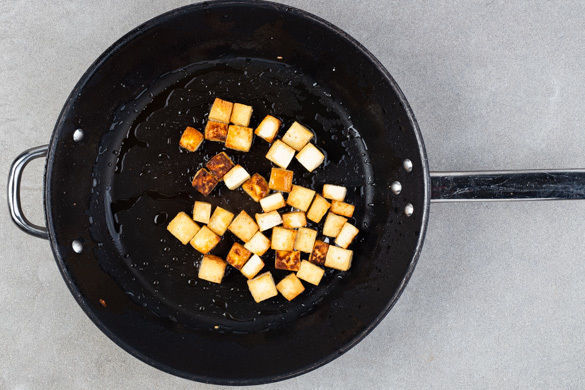 In einem großen Topf ausreichend gesalzenes Wasser für die Nudeln zum Kochen bringen. Die Tofuwürfel in einer großen Pfanne mit 2EL Pflanzenöl und 2 Prisen Salz bei starker Hitze in 8–10Min. von allen Seiten goldbraun anbraten.
