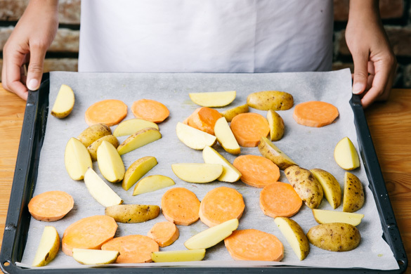 Den Backofen auf 200°C (180°C Umluft) vorheizen. Die Kartoffeln samt Schale in Spalten schneiden. Die Süßkartoffeln schälen und in ca. 0,5cm dünne Scheiben schneiden.