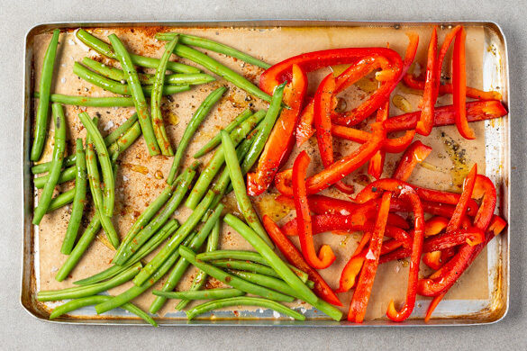 Die Paprika und Bohnen auf einem mit Backpapier ausgelegten Backblech mit 1EL Olivenöl, der 1/2 der Gewürzmischung und je 1 Prise Salz und Pfeffer vermengen, gleichmäßig verteilen und 12–15Min. im Ofen rösten, bis die Bohnen goldbraun sind und das Gemüse gar ist.