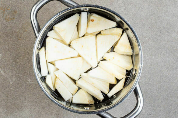 In einem großen Topf 1,2L Wasser mit 1–2EL Salz zum Kochen bringen. Den Knollensellerie vierteln, mit einem Messer schälen und in ca. 0,5cm dünne Scheiben schneiden. Den Sellerie ins kochende Wasser geben und bei mittlerer Hitze abgedeckt 13–15Min. kochen lassen, bis er weich ist. Den Sellerie anschließend in ein Sieb abgießen, abtropfen lassen und im Topf warm halten.