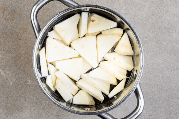 In einem mittelgroßen Topf 800ml Wasser mit 1EL Salz zum Kochen bringen. Den Knollensellerie vierteln, mit einem Messer schälen und in ca. 0,5cm dünne Scheiben schneiden. Den Sellerie ins kochende Wasser geben und bei mittlerer Hitze abgedeckt 13–15Min. kochen lassen, bis er weich ist. Den Sellerie anschließend in ein Sieb abgießen, abtropfen lassen und im Topf warm halten.