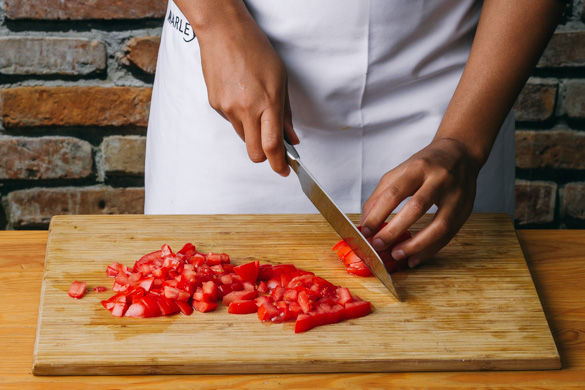 Die Tomaten in feine Würfel schneiden, dabei den Strunk entfernen.