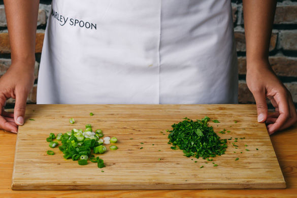 Die Lauchzwiebeln in feine Ringe schneiden. Die Petersilie samt Stängeln fein hacken. Die Zitronenschale abreiben, dann die Zitrone halbieren und auspressen. In einer Schüssel 2–3EL Zitronensaft mit 3–4EL Olivenöl, 1/2TL Senf, 1/2TL Zucker und etwas Zitronenabrieb zu einem Dressing rühren und mit Salz und Pfeffer abschmecken.