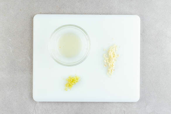 Die Kirschtomaten halbieren, zu dem Lauch in die Pfanne geben und bei mittlerer Hitze 3–4Min. mitbraten, bis die Tomaten aufplatzen. Die Zitronenschale abreiben, dann die Zitrone halbieren und auspressen. Den Knoblauch schälen und sehr fein würfeln oder durch eine Knoblauchpresse drücken.