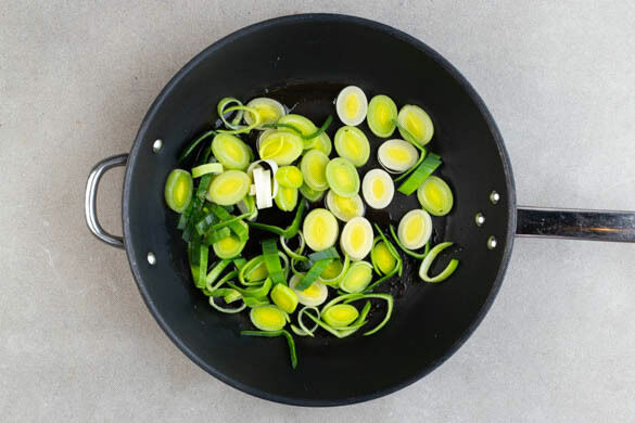 Den Backofen auf 220°C (200°C Umluft) vorheizen. In einem großen Topf ausreichend gesalzenes Wasser für die Pasta zum Kochen bringen. Den Lauch in ca. 0,5cm dünne Ringe schneiden und in einer großen Pfanne mit 4EL Margarine oder Pflanzenöl bei mittlerer Hitze 4–6Min. braten.