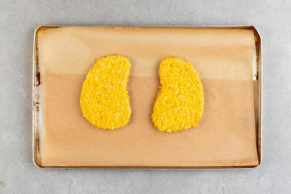 Die Schnitzel auf ein mit Backpapier ausgelegtes Backblech geben und im Ofen 8–12Min. backen, bis sie knusprig sind.