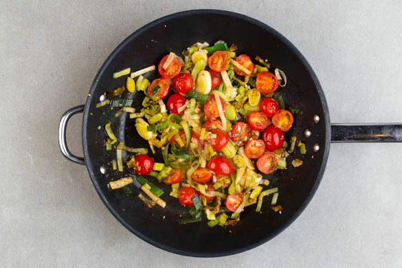 Die Kirschtomaten halbieren, zu dem Lauch in die Pfanne geben und bei mittlerer Hitze 3–4Min. mitbraten, bis die Tomaten aufplatzen. Die Zitronenschale abreiben, dann die Zitrone halbieren und auspressen. Den Knoblauch schälen und sehr fein würfeln oder durch eine Knoblauchpresse drücken.