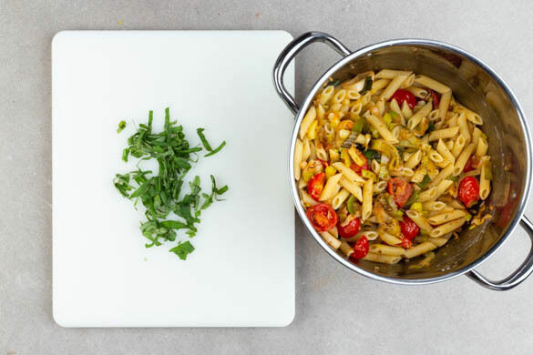 Die Pasta in das kochende Wasser geben und in 7–9Min. bissfest kochen. Ca. 1 Tasse Pastawasser abschöpfen, dann die Pasta in ein Sieb abgießen, abtropfen lassen und zurück in den Topf geben.