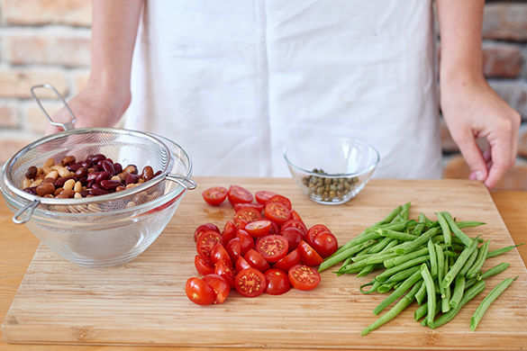 Ofen auf 200°C Umluft vorheizen. Bohnen und Kapern abtropfen lassen. Enden der grünen Bohnen entfernen. Tomaten halbieren. Alles auf ein mit Backpapier ausgelegtes Backblech geben, 2EL Öl zugeben, salzen, pfeffern und gleichmässig verteilen. Ca. 15-20Min. kross backen.