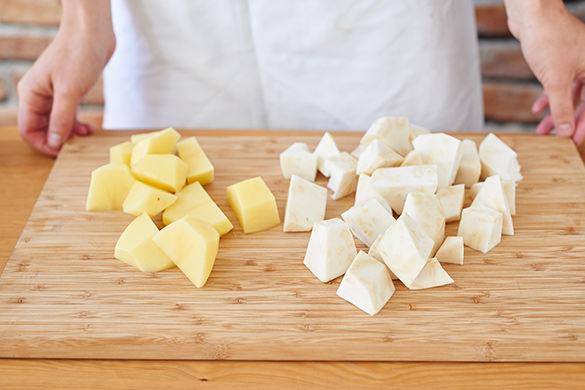 Inzwischen Kartoffeln und Sellerie schälen und in gleich große Stücke schneiden.
