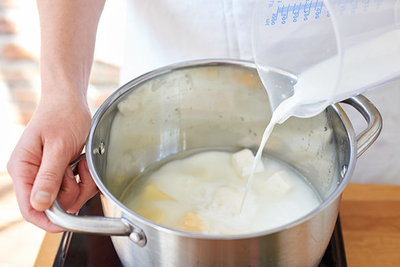 Gemüse zusammen mit 700ml Wasser und Milch in einen Topf geben, zum Kochen bringen und ca. 10-15Min. leicht köchelnd weich kochen.