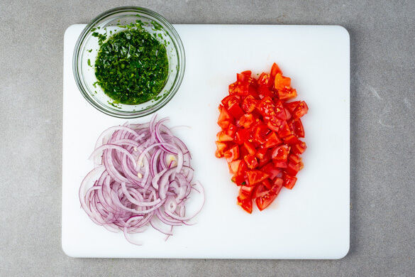 Die Petersilie samt Stängeln fein hacken, mit 2EL Olivenöl verrühren und mit Salz und Pfeffer würzen. Die Zwiebel schälen, halbieren und in feine Streifen schneiden. Die Tomaten in kleine Würfel schneiden und mit Salz und Pfeffer würzen.