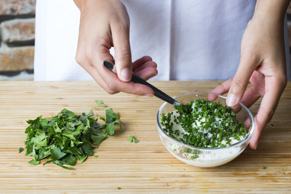 Den Schnittknoblauch in feine Ringe schneiden und mit dem Joghurt verrühren. Den Dip mit Salz und Pfeffer abschmecken. Die Petersilie samt Stängeln grob schneiden.