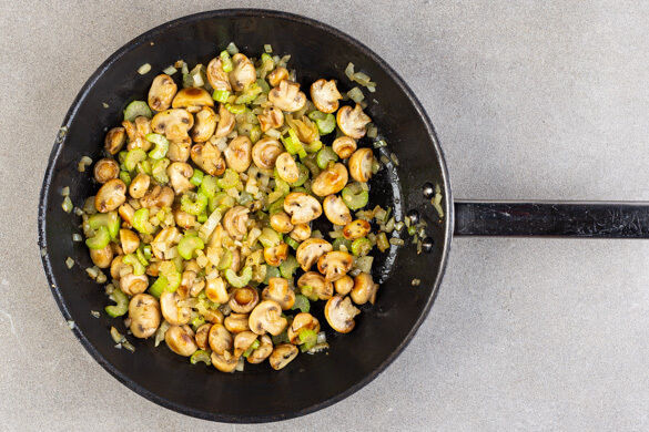 Die Zwiebel schälen und fein würfeln. Die Pilze ggf. säubern und je nach Größe halbieren oder vierteln. Den Sellerie quer in ca. 0,5cm breite Scheiben schneiden. Die Zwiebeln, den Sellerie und die Pilze mit 1 kräftigen Prise Salz und 2EL Olivenöl in der zweiten Pfanne bei sehr starker Hitze 6–8Min. braten, bis das Gemüse gar und appetitlich gebräunt ist.