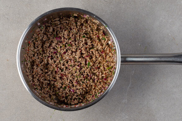 In einem großen Topf 3–4EL Wasser zum Kochen bringen. Sobald das Wasser kleine Bläschen wirft, das Hackfleisch sowie 2EL Fischsauce dazugeben und bei mittlerer Hitze 6–8Min. köcheln lassen, bis das Hackfleisch gar ist.