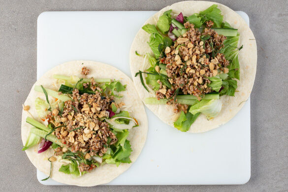 Nach einem quälend langen Tag sinkst du aufs Sofa, die Hand zuckt Richtung Telefon. Jetzt schnell den Lieferdienst rufen, Fast Food muss her. Aber halt! Den Anruf kannst du dir sparen, denn die Blitz-Mahlzeit kam mit deiner Box! Laotisch inspiriert sind diese köstlichen Wraps mit würzig-scharfem Schweinehackfleisch, knackigem Salat, Gurke, Koriander, Minze und gerösteten Erdnüsse genau das, was du heute brauchst. Hau rein!