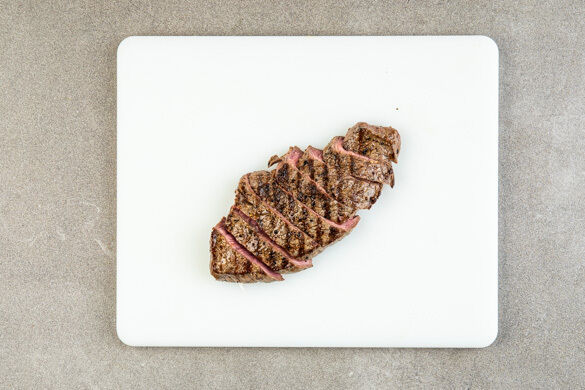 Das Fleisch in der Pfanne bei starker Hitze auf der Fettseite 2–4Min. scharf anbraten. Wenden und weitere 2–4Min. braten, je nach Dicke des Fleisches. Die Hitze reduzieren und das Fleisch 1–3Min. abgedeckt garen, je nachdem, ob es medium oder durch sein soll. Abgedeckt auf einem Teller ruhen lassen, dann in Tranchen schneiden und mit den Salaten servieren.