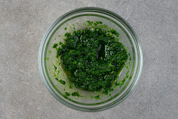 Das Basilikum und die Petersilie samt Stängeln grob schneiden. Den Knoblauch schälen und halbieren. Die Zitrone halbieren und eine Hälfte auspressen. Die Kräuter, den Knoblauch und den Zitronensaft in einem hohen Gefäß pürieren, anschließend 1TL Olivenöl unterrühren. Tipp: Wer es besonders spritzig mag, kann auch mehr Zitronensaft verwenden.