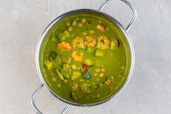 Es geht schnell, es sieht toll aus und es schmeckt noch besser. Unsere Argumentation für dieses farbenfrohe Curry ist vielleicht nicht besonders originell, dafür dürfte sie umso überzeugender sein. Wenn sich Garnelen mit nussigen Kichererbsen in einer sämigen Kokosmilch-Spinat-Matrix treffen, dann schreien die Geschmacksknospen schon vorher innerlich Hurra. Unsere Empfehlung: Kurz den Anblick genießen – und dann rein damit!