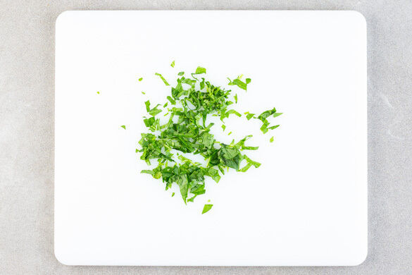 Die Zucchini längs vierteln und quer in ca. 1cm breite Stücke schneiden. Die Tomate vierteln, das Kerngehäuse entfernen und in ein hohes Püriergefäß geben, dann die Tomate in dünne Streifen schneiden.