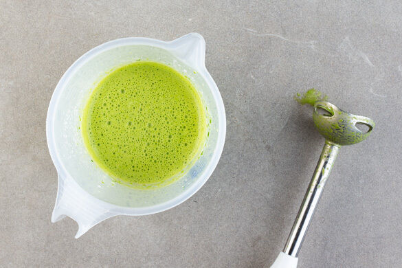 Einige Spinatblätter für die Garnitur beiseitelegen, den restlichen Spinat mit den Tomatenkernen, der Kokosmilch und 100ml Wasser mit einem Stabmixer fein pürieren.