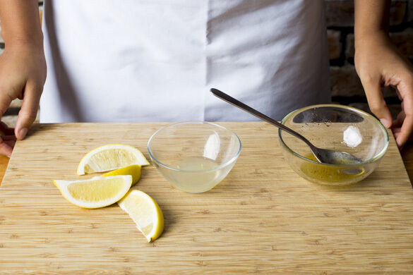 Die Zitrone halbieren und eine Hälfte auspressen, die andere Hälfte in Spalten schneiden. 1EL Olivenöl und 1–2TL Zitronensaft mit je 1 Prise Salz und Pfeffer zu einem Dressing verrühren.
