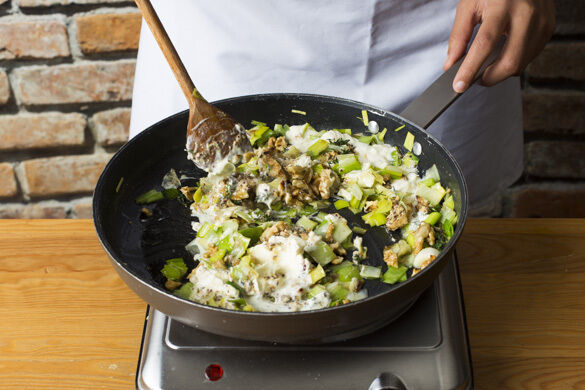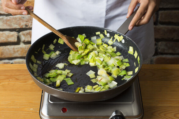Den Lauch in der großen Pfanne mit 1EL Olivenöl und 1 Prise Salz bei mittlerer Hitze ca. 30Sek. anbraten. Die Hitze leicht reduzieren und den Lauch unter gelegentlichem Rühren in ca. 10Min. weich garen, dann auf niedrige Hitze reduzieren.