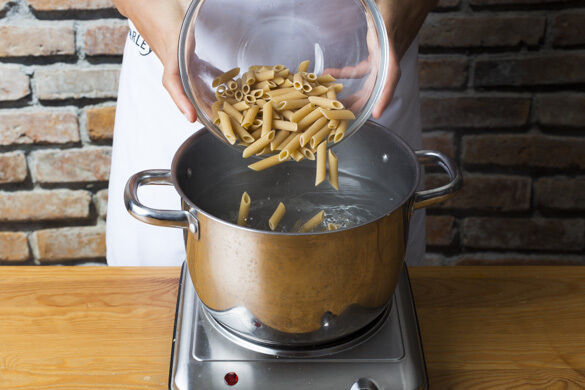 Die Pasta in das kochende Wasser geben und in 7–9Min. bissfest kochen. Mit einem Messbecher ca. 150ml Kochwasser abschöpfen, dann die Pasta in ein Sieb abgießen und abtropfen lassen.