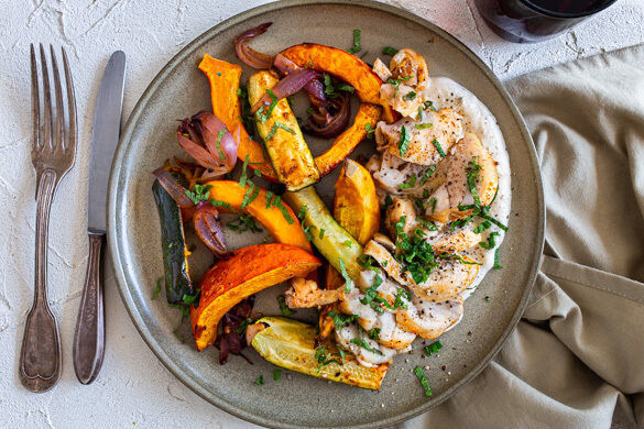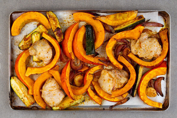 Der Duft von aromatischen Gewürzen strömt heute aus deiner Küche, denn du röstest Kürbis, Zucchini und Zwiebeln in einer feinen Mischung aus u. a. Kurkuma, Zimt und Gewürznelke. Und weil wir es unkompliziert mögen, darf das zarte Hähnchenschenkelfilet gleich mit auf das Backblech. Eine schnelle Joghurtsauce mit Tahini dazu – das ist Low Carb mit viel Genuss!