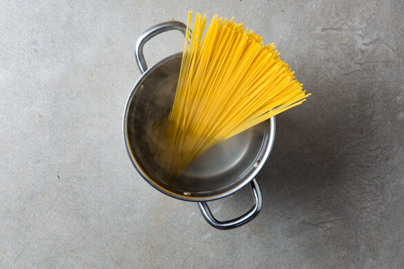 Die Pasta in das kochende Wasser geben und in 7–9Min. bissfest kochen. Ca. 150ml Pastawasser abschöpfen, dann die Pasta in ein Sieb abgießen und kalt abschrecken.